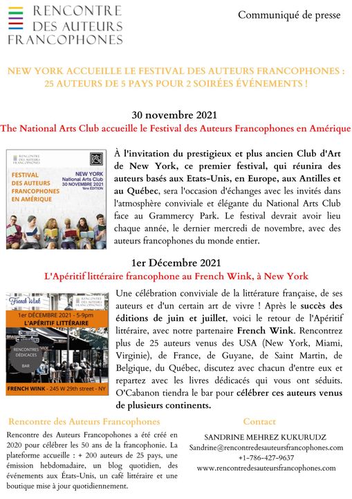 Belle aventure pour un auteur que d’être invité à un Festival international. « Rencontre des Auteurs Francophones » a organisé un événement le 30 novembre 2021 au National Arts Club de Manhattan, le plus prestigieux et ancien club d’art de New York ! Si, si, un véritable club anglo-saxon avec ses membres cooptés, ses alcôves discrètes, ses portes dérobées, ses couloirs dissimulés, ses arcanes et ses énigmes… A very mysterious place, don’t you think ? L’enjeu ? Avec 300 000 new-yorkais qui parlent français et je ne sais combien de millions aux Etats-Unis, il s’agit de sortir la littérature francophone des universités pour la diffuser dans la rue. Retrouvez le déroulé sur le site https://www.rencontredesauteursfrancophones.com/